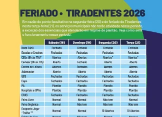 Prefeitura divulga como será o funcionamento dos serviços municipais para o feriado de Tiradentes