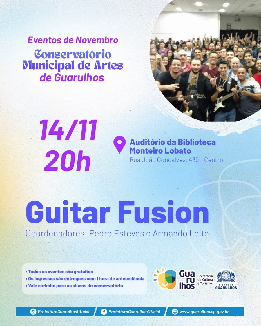 As guitarras tomarão conta do auditório da Biblioteca Monteiro Lobato no próximo dia 14 (sexta-feira), com o espetáculo do grupo Guitar Fusion. A partir das 20h, o grupo formado por alunos das turmas de jazz e rock instrumental do Conservatório Municipal de Artes sobe ao palco do local para exibir seu talento.