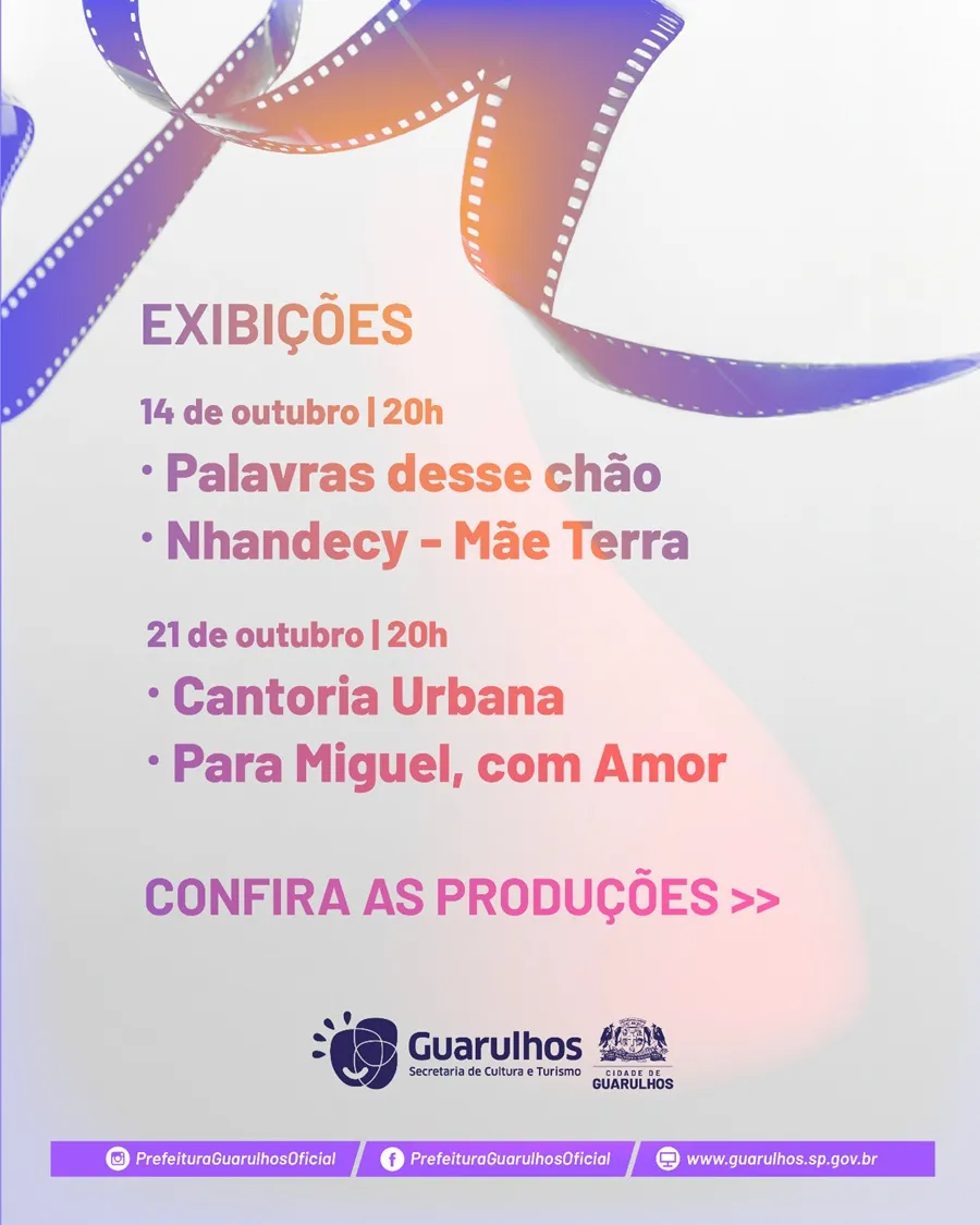Quatro produções guarulhenses serão exibidas na edição de outubro do Cine Bento, projeto que ocupa o Teatro Padre Bento com filmes e documentários produzidos por artistas da cidade. Na primeira sessão do mês, dia 14, terça-feira, às 20h, serão exibidos os filmes “Palavras Desse Chão” e, em seguida, “Nhandecy – Mãe Terra”. Também na terça, dia 21, às 20h, será a vez dos filmes “Cantoria Urbana” e “Para Miguel, com Amor”.
