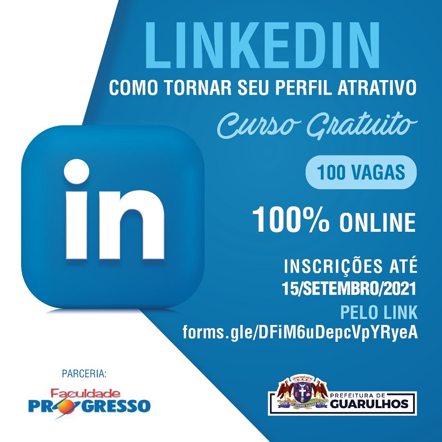 A Subsecretaria de Juventude de Guarulhos, em parceria com a Faculdade Progresso, recebe até 15 de setembro as inscrições para o curso “LinkedIn – Como Tornar seu Perfil Atrativo”. São cem vagas disponibilizadas para jovens de 15 a 29 anos e as inscrições devem ser feitas pelo link https://forms.gle/DFiM6uDepcVpYRyeA.