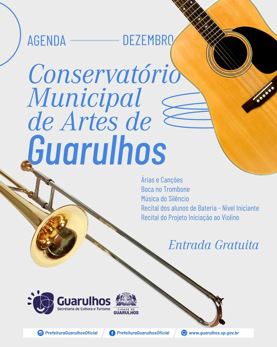 Entre os dias 1º e 6 de dezembro, os grupos musicais do Conservatório Municipal de Artes de Guarulhos realizam apresentações gratuitas em celebração ao encerramento do ano letivo. Alunos e professores sobem ao palco para darem visibilidade ao que foi aprendido em sala de aula durante os estudos.