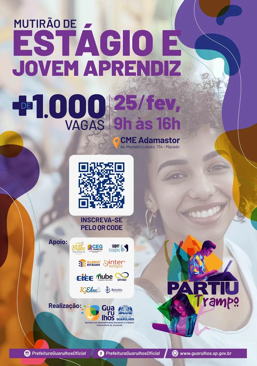 A Prefeitura de Guarulhos realizará nesta quarta-feira (25), das 9h às 16h, o Mutirão Volta às Aulas, com mais de 1.000 vagas de estágio e Jovem Aprendiz destinadas a estudantes dos ensinos médio e superior com idade entre 15 e 29 anos.
