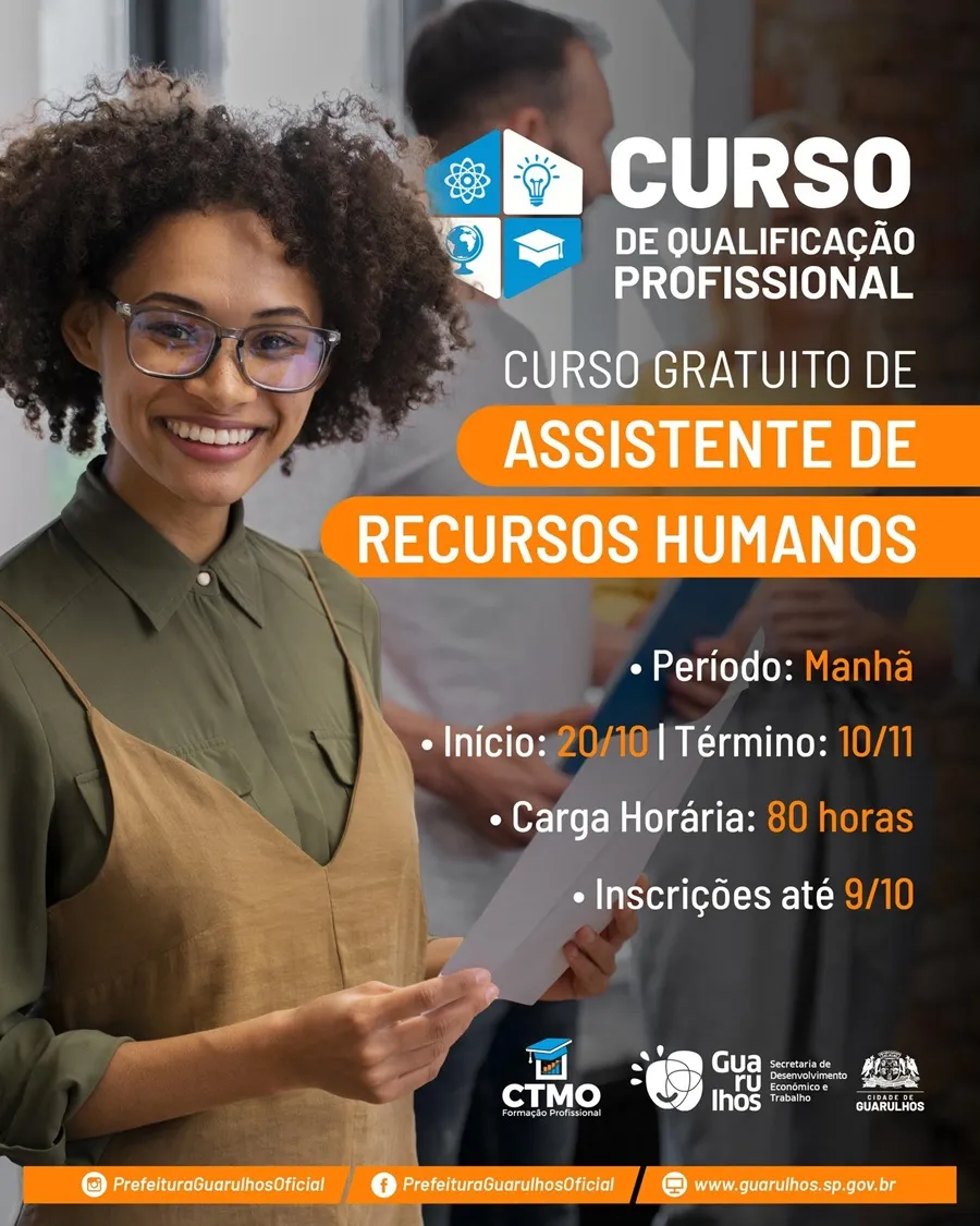 A Prefeitura de Guarulhos, em parceria com o Governo do Estado de São Paulo por meio do programa Qualifica SP, está com inscrições abertas para o curso gratuito de Assistente de Recursos Humanos. São oferecidas 20 vagas, com aulas presenciais no período da manhã.