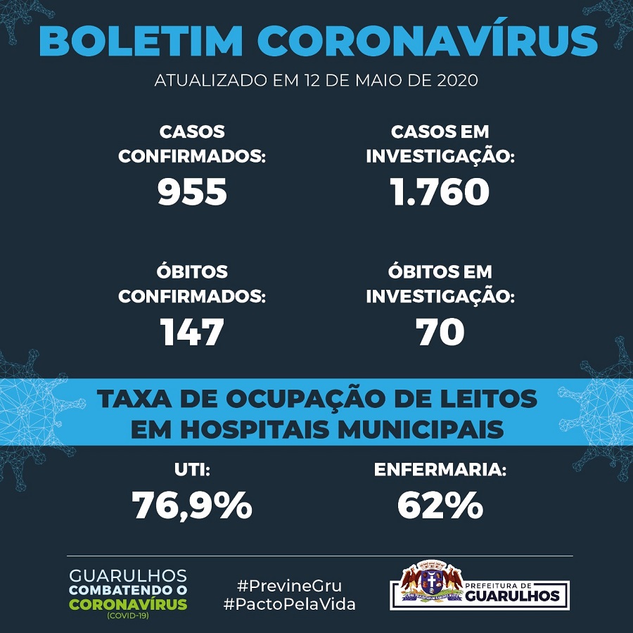 Há 15 dias Guarulhos registrava 64 óbitos ocasionados pelo coronavírus (Covid-19). Nesta terça-feira (12) a cidade contabiliza 147, com a confirmação de mais 16 mortes, sendo dez homens e seis mulheres, com idades entre 51 e 90 anos, que ocorreram nos meses de maio (8 óbitos), abril (7) e março (1). Outros setenta estão sendo investigados. Os dados são do Boletim Epidemiológico atualizado diariamente pela Secretaria Municipal da Saúde, que informa ainda o número de casos confirmados (955), descartados (2.390) e em investigação (1.760) no município.