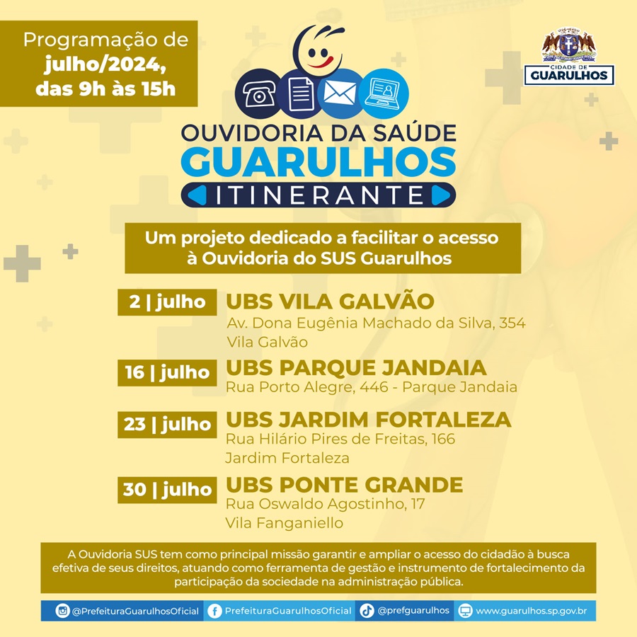 A Ouvidoria Itinerante percorre mensalmente as quatro regiões de saúde da cidade (Centro, Cantareira, São João e Pimentas) para facilitar o acesso da população à Ouvidoria do SUS Guarulhos. As pessoas que não conseguirem comparecer à UBS da Ouvidoria Itinerante podem manifestar suas opiniões sobre os serviços públicos de saúde de Guarulhos pelo telefone 0800-772-2986 ou por meio do site www.guarulhos.sp.gov.br/ouvidoria-sus.