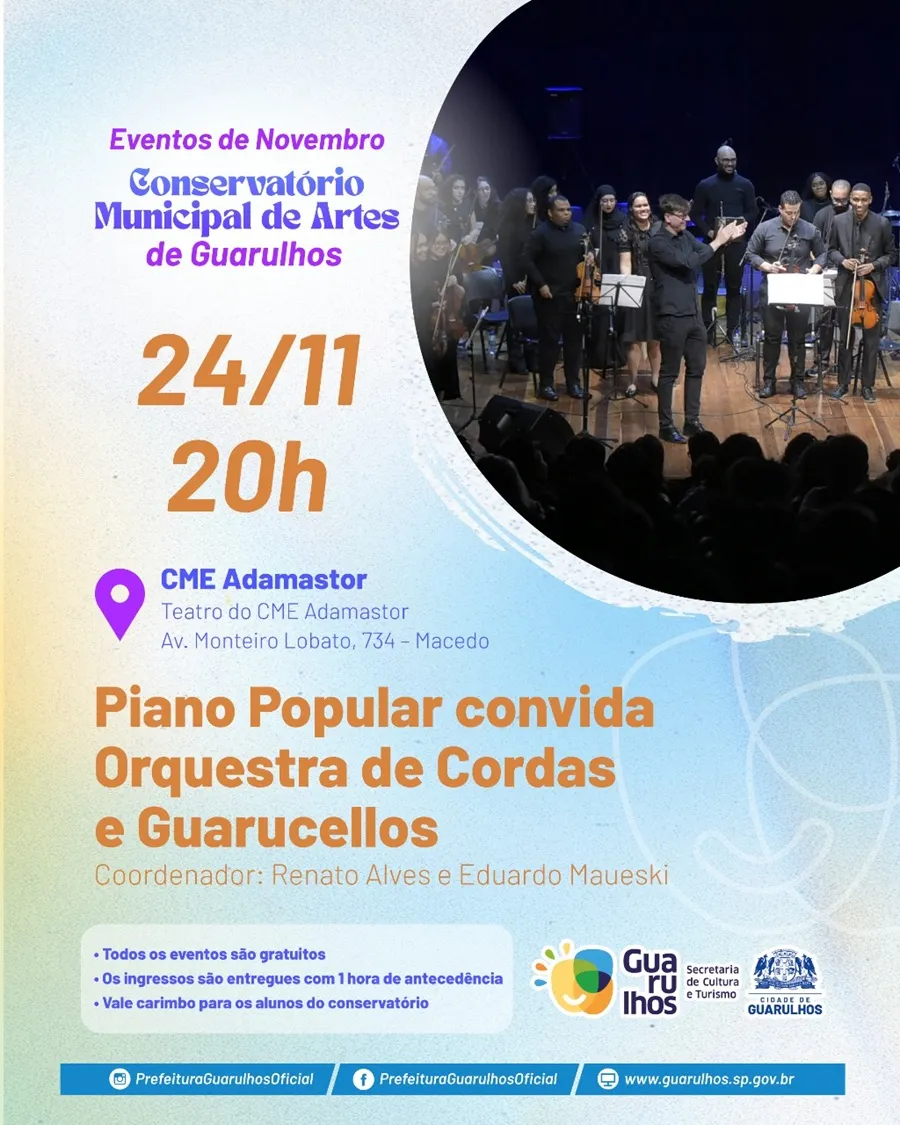 Na próxima segunda-feira (24) acontece a 3ª edição da apresentação do grupo Piano Popular, formado por alunos do Conservatório Municipal de Artes de Guarulhos, que nesta edição convida a Orquestra de Cordas e o Guarucellos. O evento acontece no Teatro Adamastor, a partir das 20h e tem entrada gratuita.