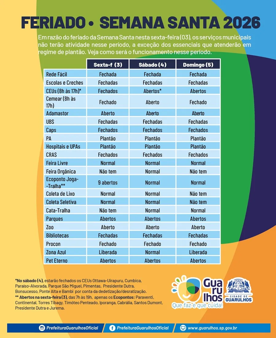 Em razão do feriado da Semana Santa nesta sexta-feira (03), os serviços municipais não terão atividade nesse período, a exceção dos essenciais que atenderão em regime de plantão. Veja abaixo como será o funcionamento nesse período.