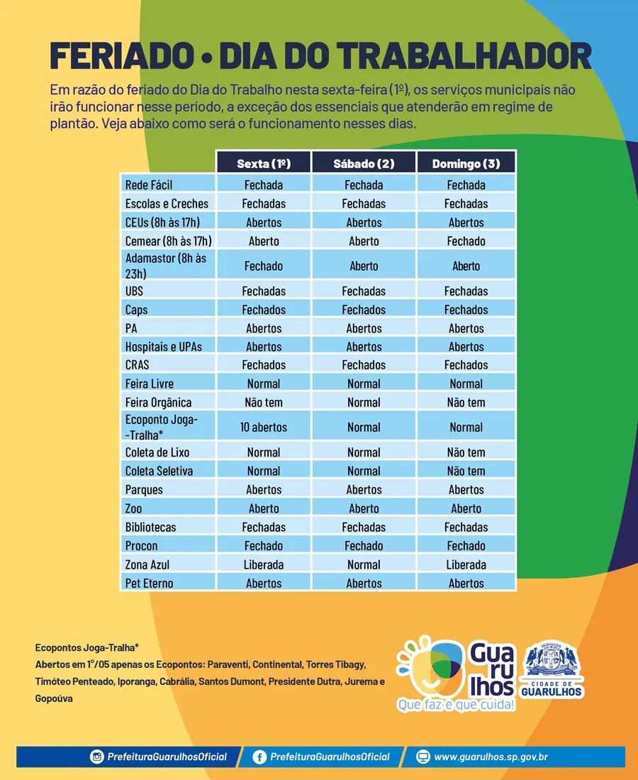 Em razão do feriado do Dia do Trabalho nesta sexta-feira (1º), os serviços municipais não irão funcionar nesse período, a exceção dos essenciais que atenderão em regime de plantão. Veja abaixo como será o funcionamento nesses dias: