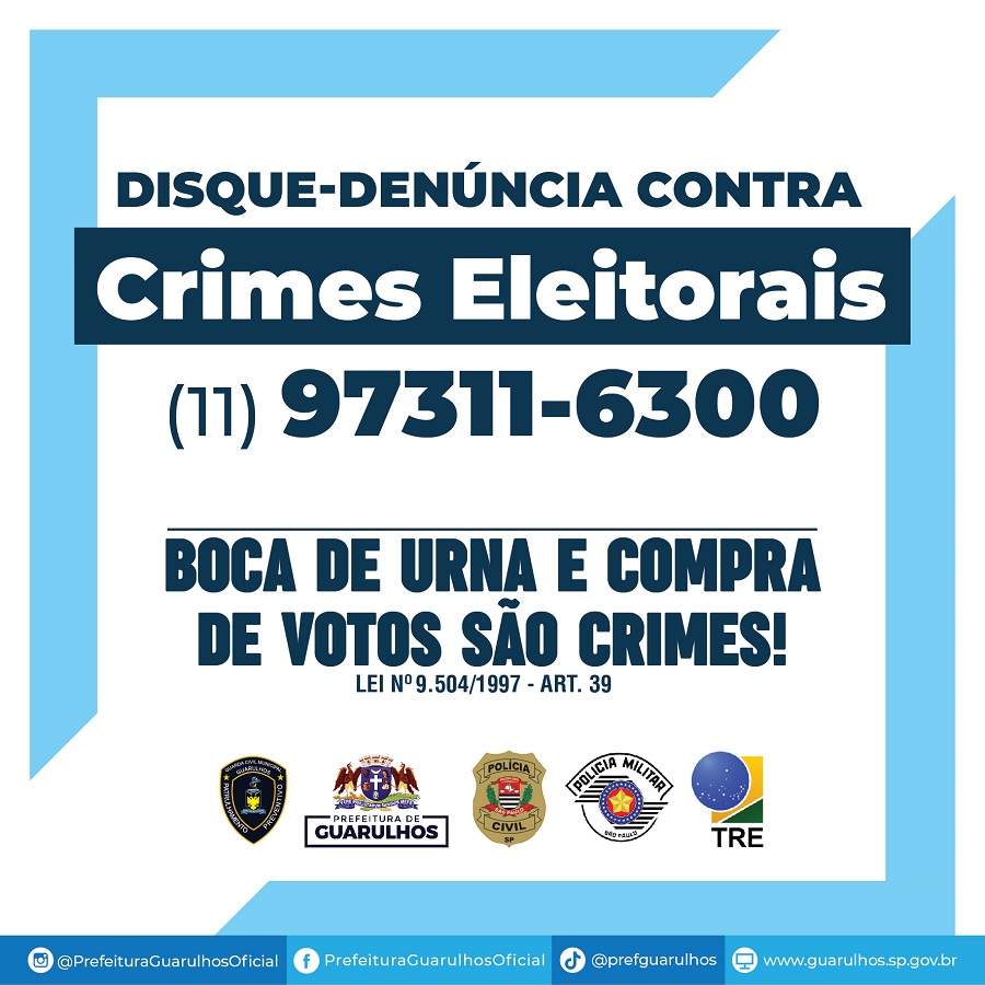 A partir das 15h desta sexta-feira (30) até as 22h de domingo (2), a Prefeitura de Guarulhos disponibiliza o disque-denúncia para crimes eleitorais, por meio do telefone (11) 97311-6300. Como parte da força-tarefa entre a Guarda Civil Municipal (GCM) e as polícias Civil e Militar, o canal tem o objetivo de garantir a lisura do processo democrático e a segurança dos eleitores durante a votação do primeiro turno das eleições 2022.