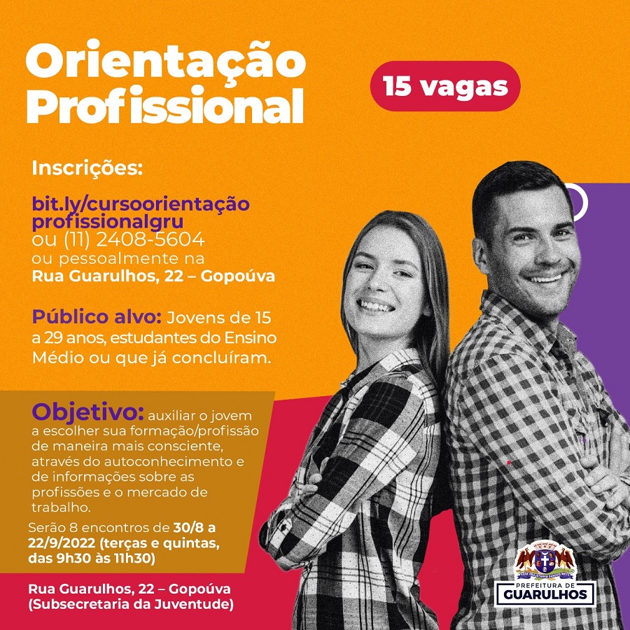 A partir desta quarta-feira (10) até 26 de agosto a Prefeitura de Guarulhos recebe inscrições de jovens para orientação profissional. A iniciativa da Subsecretaria da Juventude, integrante da Secretaria de Direitos Humanos, é voltada para o público de 15 a 29 anos, estudantes do ensino médio ou que já o concluíram. São disponibilizadas 15 vagas e os interessados devem se inscrever pelo link  https://forms.gle/rYyGVimaYs7CGKXQA, pelo telefone (11) 2408-5604 ou pessoalmente na Casa do Jovem (rua Guarulhos, 22, Gopoúva).
