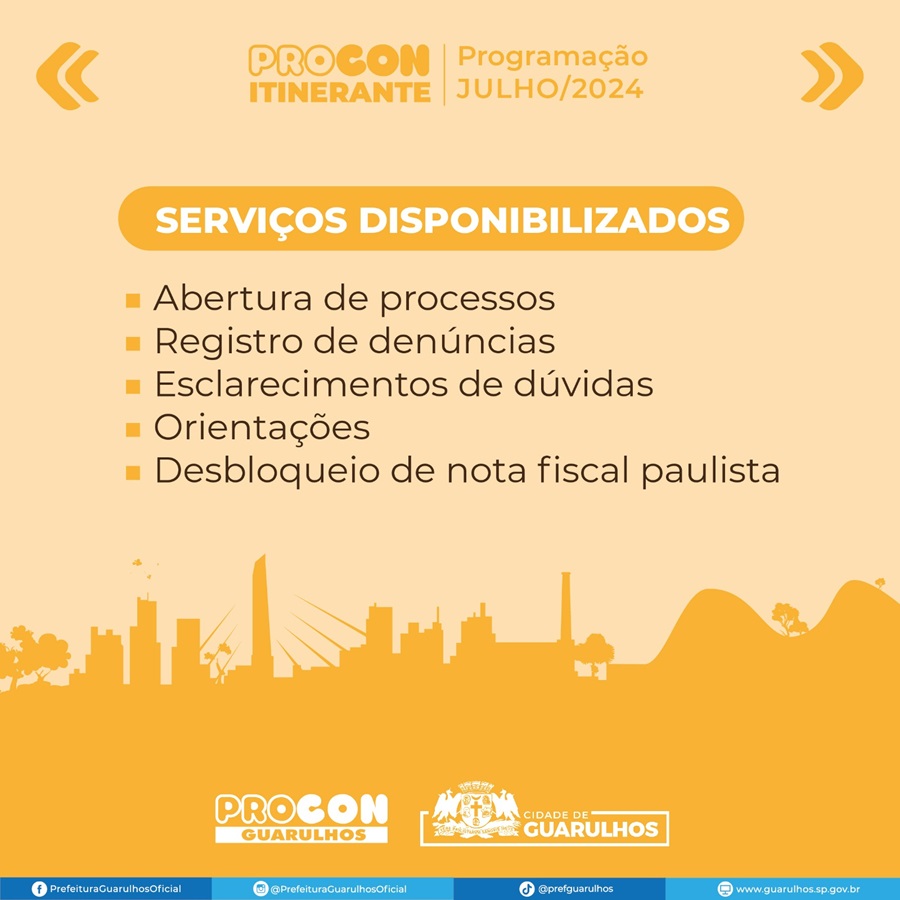 Ao longo do mês de julho a unidade móvel Procon Itinerante, que semanalmente atende a população em diferentes bairros de Guarulhos das 10h às 16h, estará no Taboão, no Jardim Monte Carmelo, no Parque Uirapuru e no Parque Industrial Cumbica. No sábado (6) a van do Procon estará na praça Oito de Dezembro, próxima à feira livre, no Taboão.