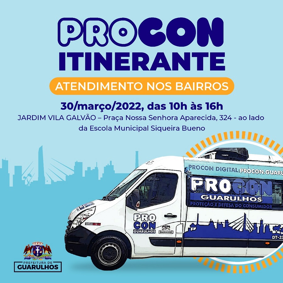 Os moradores do Jardim Vila Galvão têm encontro marcado nesta quarta-feira (30) com o Procon Itinerante, o furgão volante do órgão de proteção e defesa do consumidor guarulhense, que atenderá os consumidores das 10h às 16h na praça Nossa Senhora Aparecida, 324 (ao lado da EPG Siqueira Bueno).