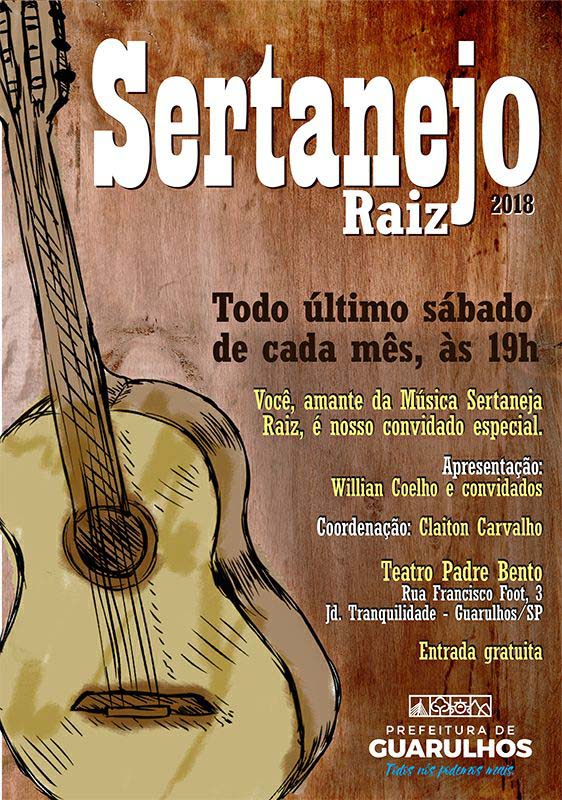 O Teatro Padre Bento, no Jardim Tranquilidade, será palco de mais uma edição de sucesso do Encontro Sertanejo Raiz no dia 31 de março (sábado), a partir das 19 horas. O evento é gratuito e reúne músicos de Guarulhos e aficionados por esse estilo musical, que têm ampla história na cultura da cidade. A classificação é livre.