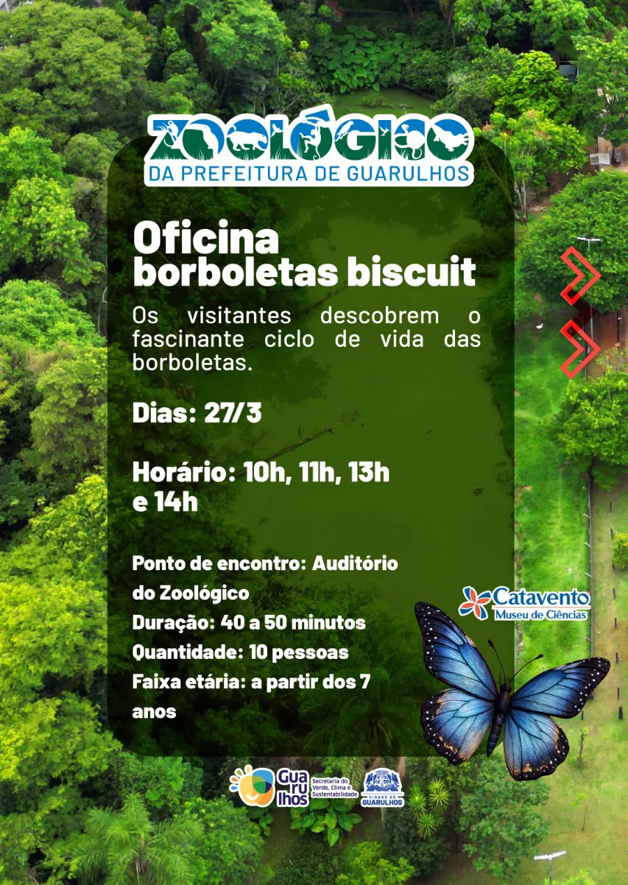Toda a criançada com idade a partir de 7 anos está convidada a participar da oficina Borboletas Biscuit nesta sexta-feira (27), no auditório do Zoológico Municipal, no Jardim Rosa de França.